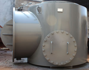 | 收球網(wǎng)是膠球清洗系統(tǒng)中的關(guān)鍵設(shè)備,它安裝于凝汽器出水管段上,攜帶海綿膠球的冷卻水,通過凝汽器管束,它的作用是把膠球從冷卻水中分離出來,且必須具備不漏球、不卡球的性能,球被回收后由引出管從收球網(wǎng)引出打回裝球室。我廠生產(chǎn)的收球網(wǎng)是目前最先進(jìn)的結(jié)構(gòu)形式,它的柵網(wǎng)板可以轉(zhuǎn)動;在膠球裝置投運(yùn)時,網(wǎng)板處于收球位置,在不投運(yùn)清洗裝置時,該柵網(wǎng)板可以旋轉(zhuǎn)到與水流方向一致的位置;既減少水阻又起到清除柵板上雜物的作用。網(wǎng)板的轉(zhuǎn)動定位由電動執(zhí)行機(jī)構(gòu)執(zhí)行(小型收球網(wǎng)為手動控制)。柵網(wǎng)板到位與否是保證收球網(wǎng)收球效率的關(guān)鍵之外。具體形式有SD(單網(wǎng)片)、 SF(A字分流式)、SLD(漏斗型)型。一、SD型收球網(wǎng)型號:1、 結(jié)構(gòu)特點(diǎn) SD型收球網(wǎng)由一個網(wǎng)板、一個操作軸、導(dǎo)流翼、外殼、操作機(jī)構(gòu)(電動執(zhí)行機(jī)構(gòu))等組成。網(wǎng)板由不銹鋼條制成,可以轉(zhuǎn)動,當(dāng)網(wǎng)板靠在外殼壁上時為收球位置,轉(zhuǎn)動一定角度到達(dá)反洗位。2、 工作原理 ?、?nbsp;收球位置:當(dāng)系統(tǒng)運(yùn)行時,網(wǎng)板處于收球位置,此時網(wǎng)板四周緊貼外殼內(nèi)壁,膠球通過網(wǎng)板阻攔在一側(cè)匯集,經(jīng)引出管,被一小股水流攜帶吸入膠球輸送泵,這樣,膠球又被送回裝球室進(jìn)行再循環(huán)使用。 ?、?nbsp;反洗位置:網(wǎng)板前后壓差達(dá)一定值時,操作網(wǎng)板至反洗位(收球后進(jìn)行),此時積存在網(wǎng)板上的雜物,就會被冷卻水流沖洗并攜帶走。3、 主要技術(shù)參數(shù) 收球率:≥95% 水 阻:≤300mmH2O 網(wǎng)板板條間距:7mm 電 源: 380V4、設(shè)備外形與結(jié)構(gòu)尺寸 |